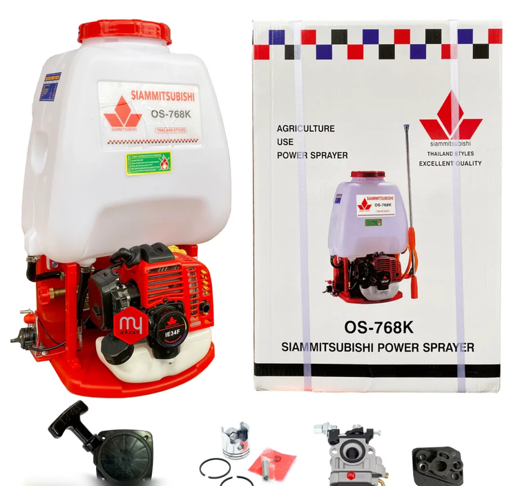 سمپاش پشتی موتوری لانسی میتسوبیشی مدل OS 768K ، محصول کمپانی MITSUBISHI با قدرت موتور بنزینی میتسوبیشی مدل IE34F و توان 1.5 اسب بخار با عملکرد دو زمانه و استارت هندلی تولید گردیده است.